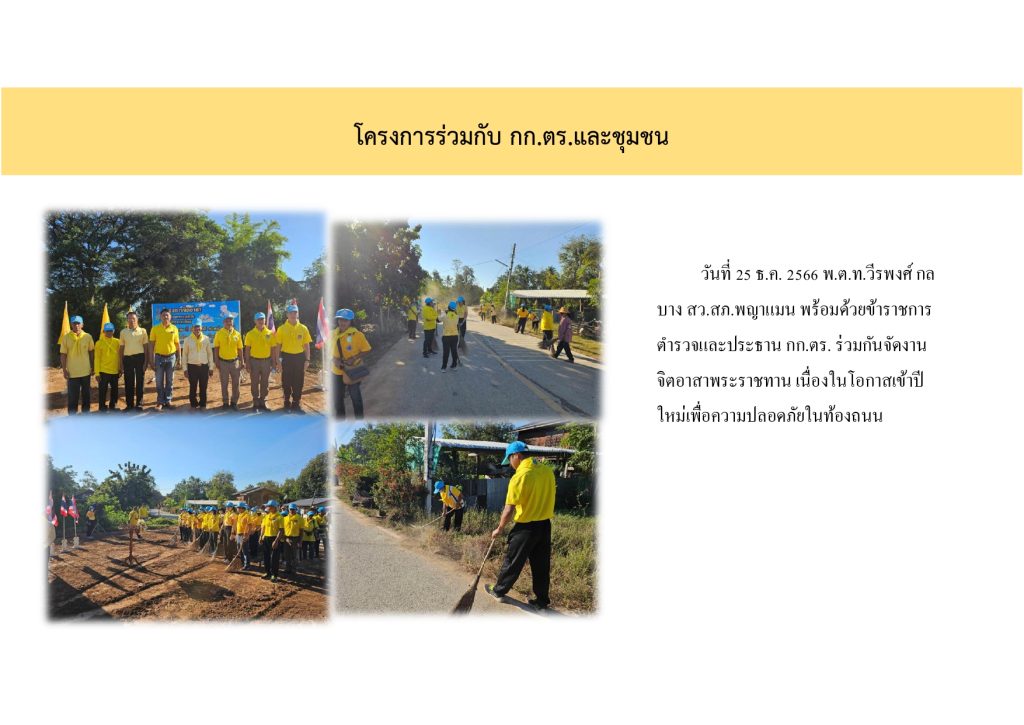 4. เชิญคณะ กต.ตร.สภ.พญาแมน เพื่อร่วมกิจกรรมจิตอาสาทำความสะอาดถนน หน้า สภ.พญาแมน ในวันจันทร์ที่ 22 ธันวาคม 2566 เวลา 09.00 น.