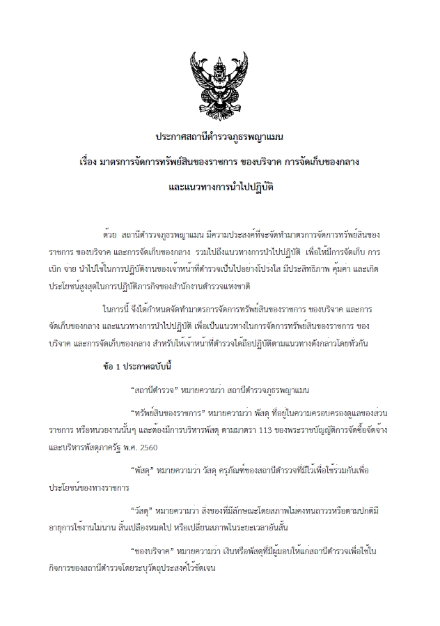 ประกาศสถานีตำรวจภูธรพญาแมน จังหวัดอุตรดิตถ์ เรื่อง การจัดการทรัพย์สินของราชการ ของบริจาค การจัดเก็บของกลาง และแนวทางการนำไปปฏิบัติ