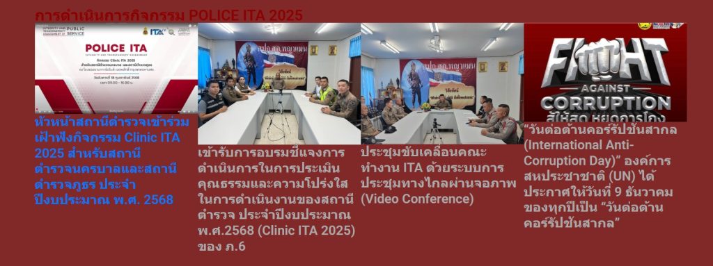 เมื่อวันที่ ๒๖ พฤศจิกายน ๒๕๖๗ เวลา ๐๙.๐๐ – ๑๖.๐๐ น. สำนักงานคณะกรรมการป้องกันและปราบปรามการทุจริตแห่งชาติ (ป.ป.ช.) ได้จัดกิจกรรมชี้แจงการประเมินคุณธรรมและความโปร่งใสในการดำเนินงานของหน่วยงานภาครัฐ (ITA) ของสถานีตำรวจ ปี ๒๕๖๘ ให้แก่ข้าราชการตำรวจในสังกัดสำนักงานตำรวจแห่งชาติ ผ่านระบบออนไลน์ ซึ่ง ตำรวจภูธรภาค ๖ โดย พล.ต.ต.พงศธร เครียดธฤมาล ผบก.อก. เป็นประธาน พ.ต.อ.ศาสตรา อ่อนรัศมี รอง ผบก.อก.ภ.๖ พร้อมคณะทำงานฯ ภาค ๖ , รอง ผบก.ภ.จว.ทุกจังหวัดในสังกัด ภ.๖ ถ่ายทอดไปยัง ๑๔๗ สถานีตำรวจในสังกัดตำรวจภูธรภาค ๖