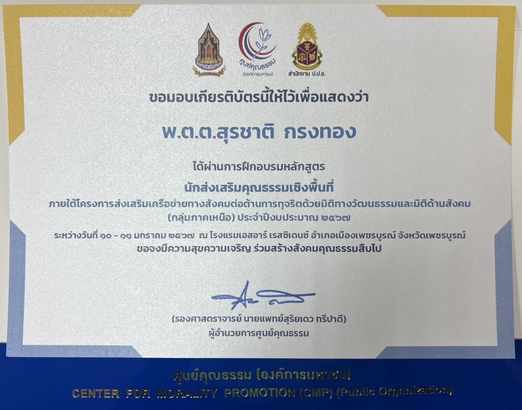 วันที่ 10-11 ม.ค. 2567 พ.ต.ต.สุรชาติ กรงทอง สวป.(ชส.)สภ.ลับแล เข้าร่วมฝึกอบรมหลักสูตร “นักส่งเสริมคุณธรรมเชิงพื้นที่” ภายใต้โครงการส่งเสริมเครือข่ายทางสังคม ต่อต้านการทุจริตด้วยมิติทางวัฒนธรรมและมิติด้านสังคม (กลุ่มภาคเหนือ) ณ โรงแรมเอสอาร์ เรสซิเดนซ์ อ.เมืองเพชรบูรณ์ จ.เพชรบูรณ์